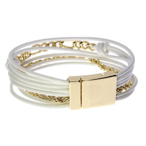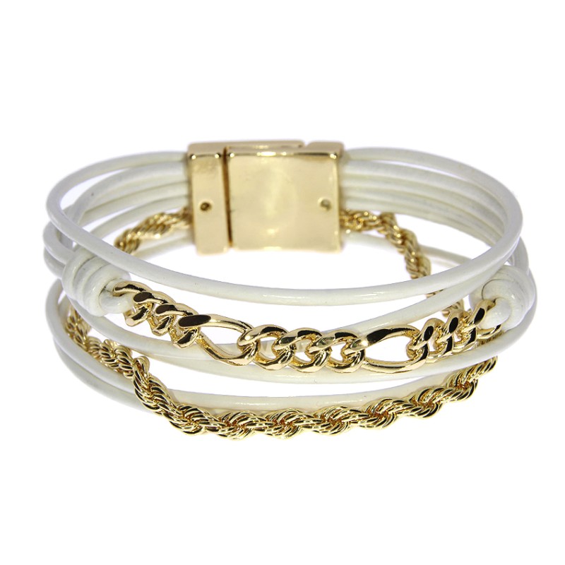 Efektowna bransoletka z białych skórzanych rzemyków i pozłacanych łańcuszków o splocie kordel. Kolekcja sklepu Pruchnik biżuteria LipGold.pl