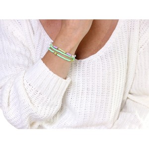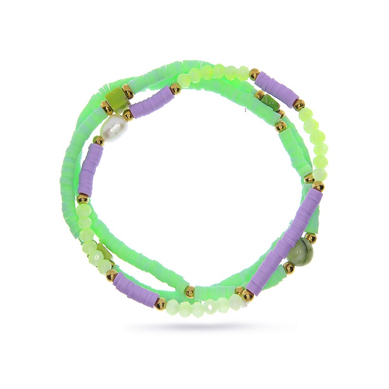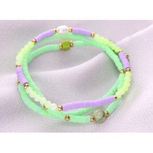 Bransoletka na gumce jubilerskiej w pastelowych kolorach seledynowym, żółtym i fioletowym z koralikami fimo i perłą hodowlaną. Kolekcja sklepu Pruchnik biżuteria LipGold.pl