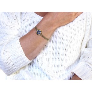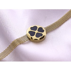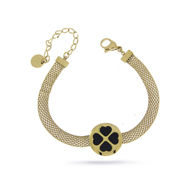 Stylowa bransoletka ze stali szlachetnej w całości pozłacanej 18ct złotem na bransolecie o splocie łańcuszkowej bismark oraz elementem w postaci koniczynki na szczęście. Kolekcja sklepu Pruchnik biżuteria LipGold.pl