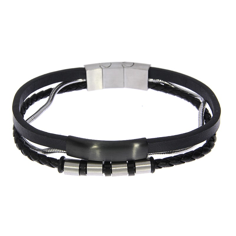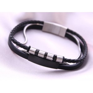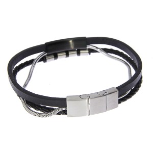 Bransoletka męska czarna skórzana ze srebrnym łańcuszuskiem