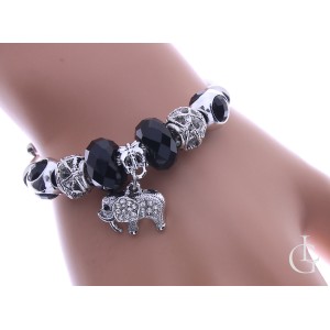 Bransoletka modułowa z wysokiej jakości stali szlachetnej z charmsami w postaci słonika z podniesioną trąbą, oraz z koralikami ze szkła fasetowanego w czarnym kolorze. Kolekcja sklepu LipGold.pl