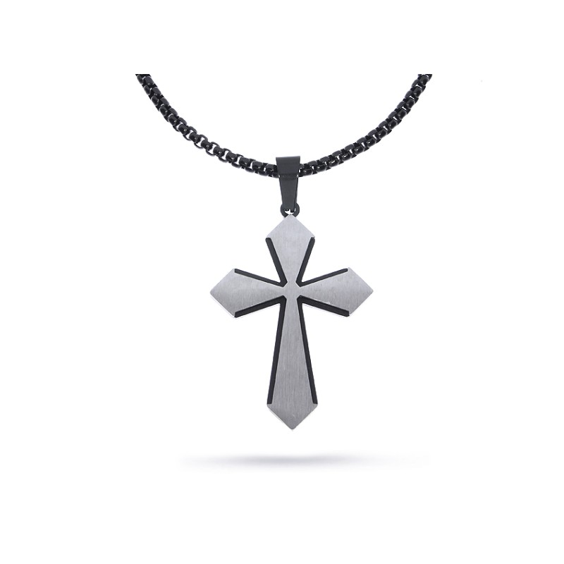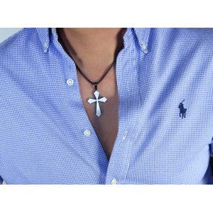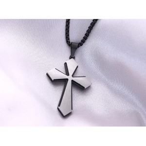 Czarny naszyjnik męski z krzyżem w srebrnym kolorze stal szlachetna