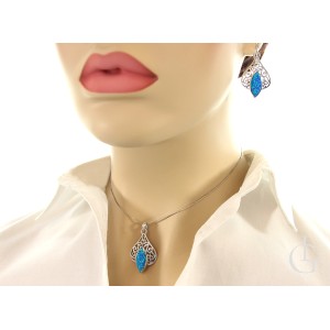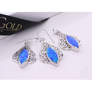 Komplet biżuterii ze srebra rodowanego pr.0,925 wiszące kolczyki i wisiorek z opalem błękitnym i ażurowym wykończeniem. Kolekcja sklepu LipGold.pl