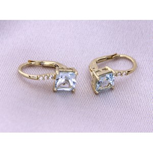 Efektowne kolczyki z klasycznego złota pr.0,585 z kwadratową cyrkonią w kolorze topazu błękitnego i klasycznych kamieni. Kolekcja sklepu LipGold.pl