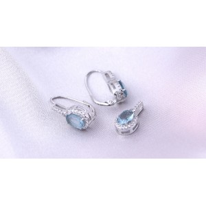 Prześliczny komplet biżuterii damskiej ze srebra rodowanego pr.0,925 składający się z delikatnie wiszących kolczyków i wisiorka z cyrkoniami klasycznymi i w kolorze topazu błękitnego. Kolekcja sklepu LipGold.pl