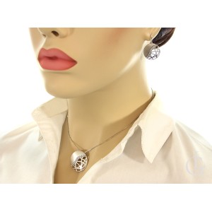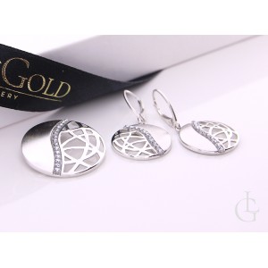 Komplet biżuterii damskiej ze srebra rodowanego pr.0,925 z satynowym wykończeniem i cyrkoniami. Biżuteria składa się z wiszących kolczyków i wisiorka. Kolekcja sklepu LipGold.pl