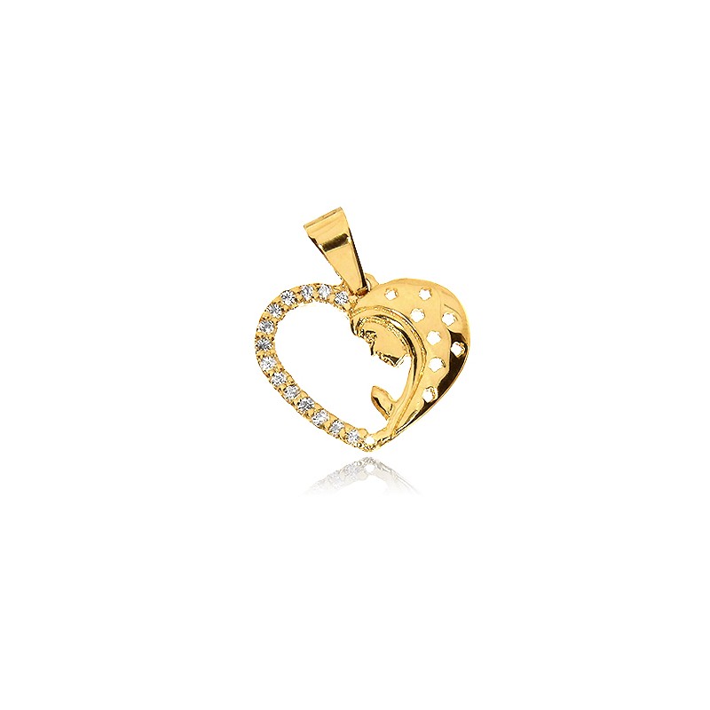 Delikatny i subtelny medalik ze złota pr.0,585 w kształcie serduszka z cyrkoniami z Matką Bożą modlącą się. Idealna biżuteria na prezent komunijny czy Chrzest. Kolekcja sklepu LipGold.pl