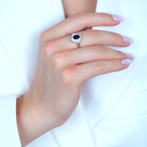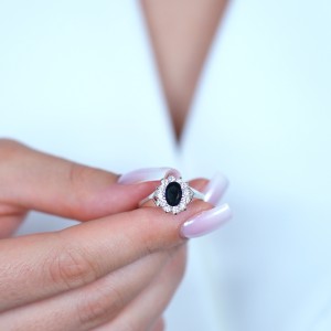 Srebrny pierścionek markiza z czarną i klasycznymi cyrkoniami