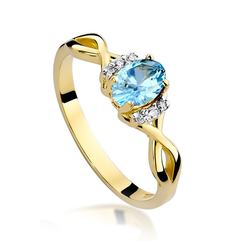 Cudowny i wyrazisty pierścionek wykonany z klasycznego złota pr.0,585 z topazem błękitnym i brylantami po bokach. Pierścionek można zamówić w każdym rozmiarze i z wieloma kamieniami naturalnymi. Każdy pierścionek wykonywany jest na zamówienie klienta i czas oczekiwania wynosi ok.5 dni. Każdy pierścionek posiada certyfikat autentyczności kamieni i kruszcu, z którego jest wykonany. Kolekcja sklepu LipGold.pl